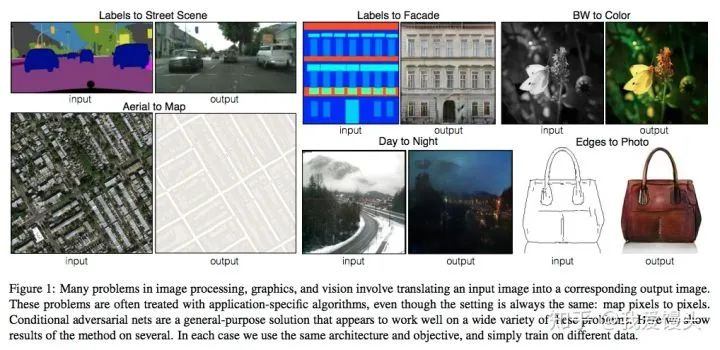 所谓图像翻译,指从一副图像到另一副图像的转换。可以类比机器翻译,一种语言转换为另一种语言。下图就是一些典型的图像翻译任务:比如语义分割图转换为真实街景图,灰色图转换为彩色图,白天转换为黑夜......