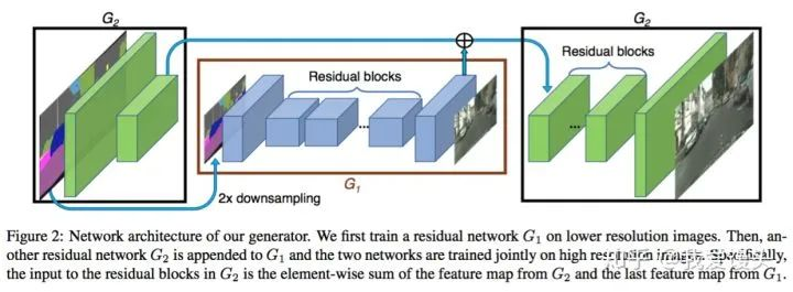 生成器由两部分组成,G1和G2,其中G2又被割裂成两个部分。G1和pix2pix的生成器没有差别,就是一个end2end的U-Net结构。G2的左半部分提取特征,并和G1的输出层的前一层特征进行相加融合信息,把融合后的信息送入G2的后半部分输出高分辨率图像。