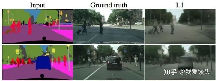 拿下图第二排的分割图 街景图为例,语义分割图的每个标签比如“汽车”可能对应不同样式,颜色的汽车。那么模型学习到的会是所有不同汽车的评均,这样会造成模糊。下图第三列就是直接用L1 Loss来学习得到的结果,相比于Ground truth,模糊很严重