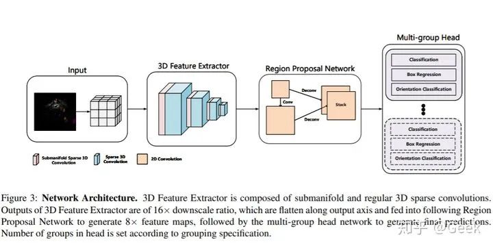 使用稀疏3D卷积和skip connection来构建类似resnet的体系结构3D特征提取器网络。这边注意三维的卷积完,会从原本的N ×C ×H ×W变成N× l × C/m × H/n × W/n,五维的没办法用二维RPN进行操作,所以作者讲 l × C/m合并,变回四维,最后使用RPN是类似于VoxelNet的RPN结构(跟SSD类似),先用二维卷积降维三次,才分别反卷积回原大小,Concate在一起,有点类似特徵金字塔的味道,但最后输出是Concate所有从低到高层次的特徵。