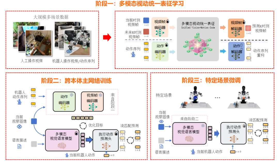 具体来说,XR-1的性能,源于其三大技术创新。首先,它采用了独创的UVMC(多模态视动统一表征)技术,通过这项技术,可以将视觉观察、语言指令和机器人动作在统一的表征空间中进行学习,让机器人能够利用海量人类视频进行训练,降低训练成本提升训练效率;同时,它能够搭建起视觉与动作的映射桥梁,让模型能真正理解“看到什么”与“该如何动”之间的内在关联。