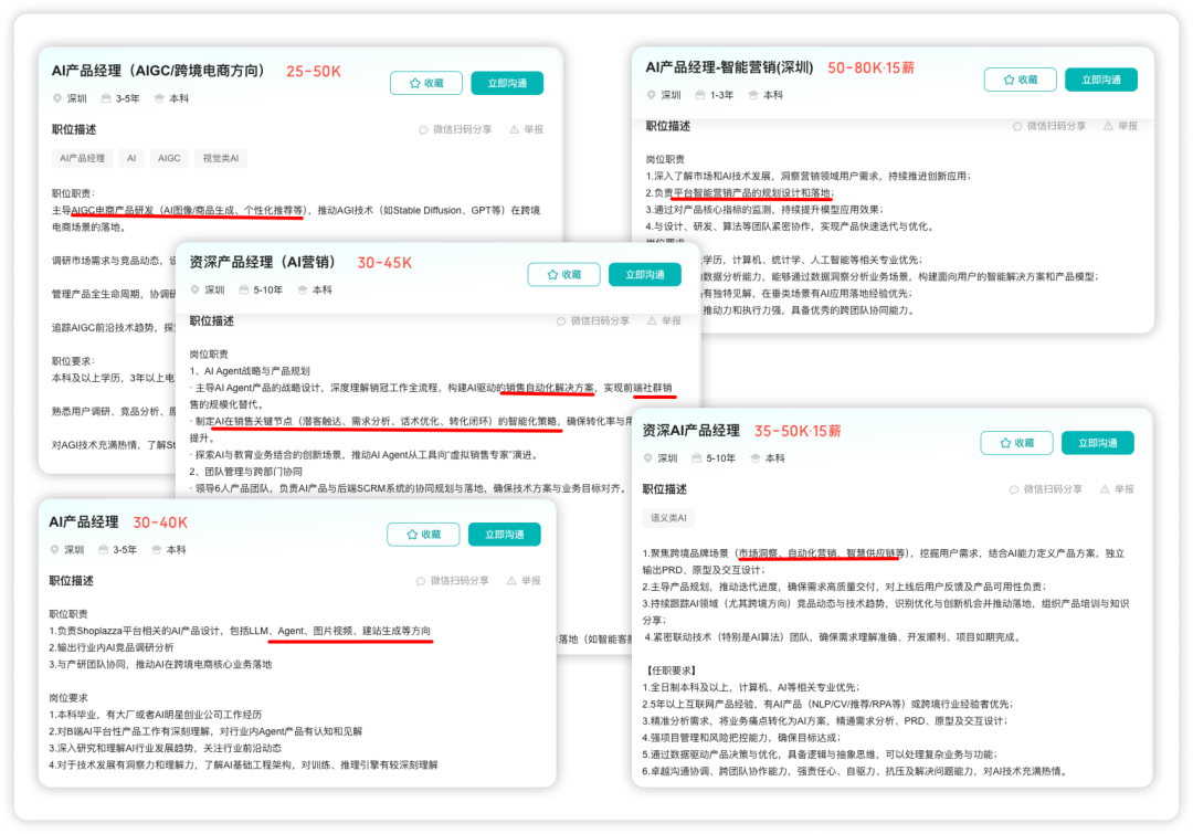 如果你在深圳工作,会发现招聘平台上一半都是跨境电商公司,其中 80%以上的 AI 产品经理招聘需求都是做营销赋能。