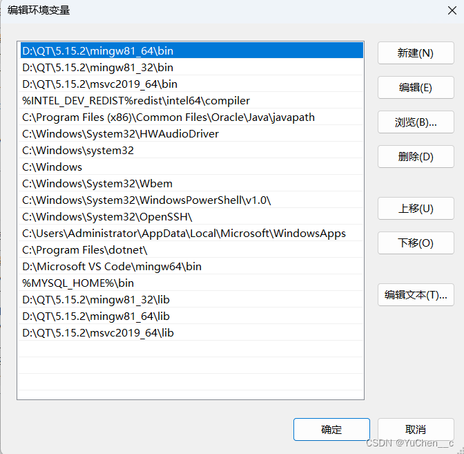 关于配置环境变量的一些经历 在配置MySQL和QT的环境变量时都遇到了一直失败的状况,明明是按照大佬们提供的方法一步一步来了,但总会出现错误的结果。在继续探索中看到了新的经验是把新配置的环境变量放置在上面 如图。这些很小的细节如果没人教就永远也不能发现吧。利用上移操作成功解决问题。