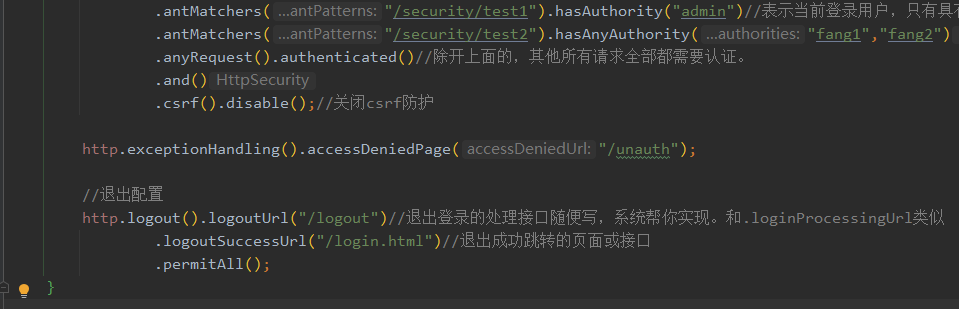 http.logout().logoutUrl("/logout")//退出登录的处理接口随便写,系统帮你实现。和.loginProcessingUrl类似