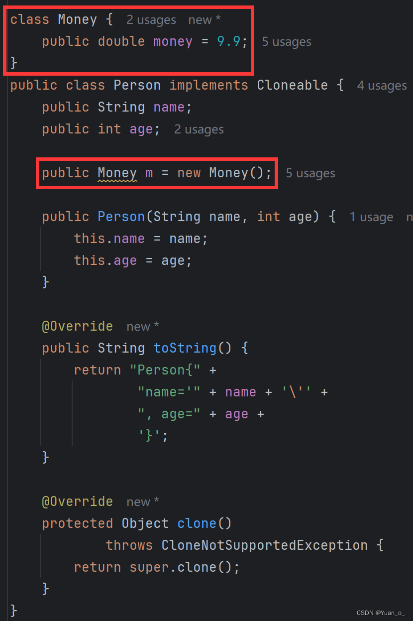 结论:只克隆了Person对象,没有克隆Money对象,这种现象就叫做——浅拷贝