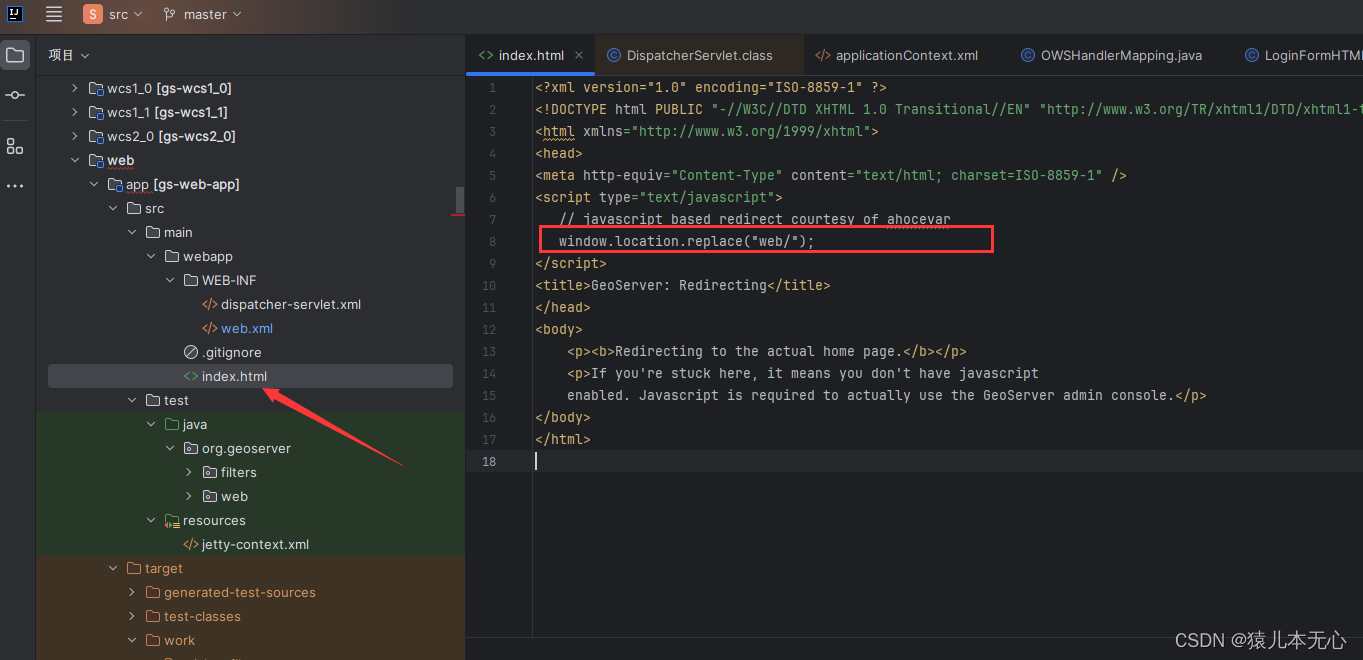 从上图可以看出index.html是个空页面,而且被重定向到“web/”。很显然src/web/app/src/main/webapp路径下没有web的文件夹,那么就能猜出来地址肯定又被哪个地方拦截了,然后就能想到servlet的Mapping 和 Filter