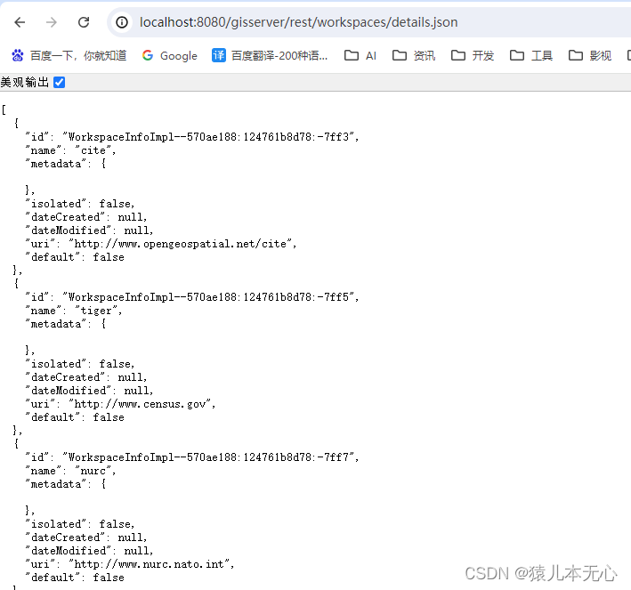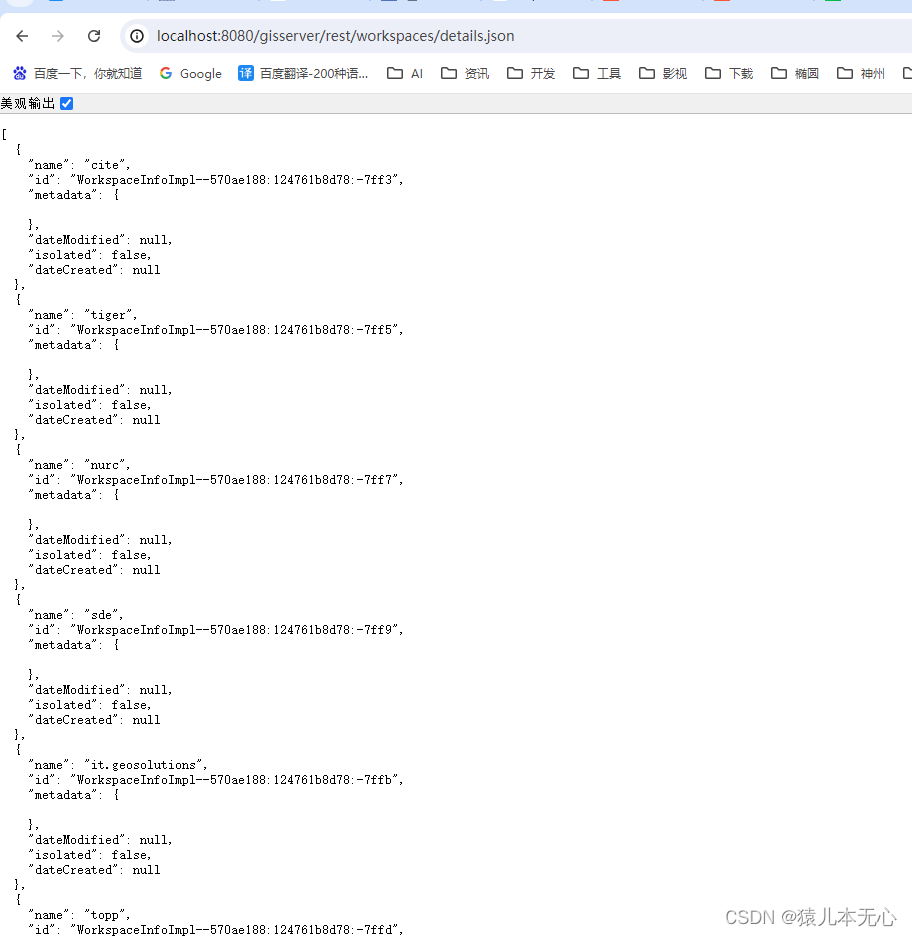 http://localhost:8080/geoserver/rest/workspaces (浏览器预览居多)