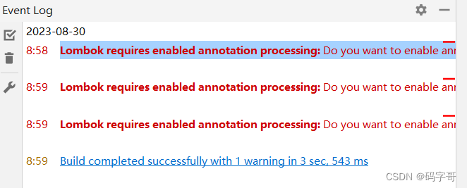 Lombok requires enabled annotation processing: Do you want to enable annotation processors? Enable 你的IDEA上是不是老是报这个东西,如果报这个东西真的很烦,其实可以不用弄,没有什么影响。这个是错误提示信息,这个是Lombok插件的问题。这样基本上就可以解决了。不影响你敲代码的速度。