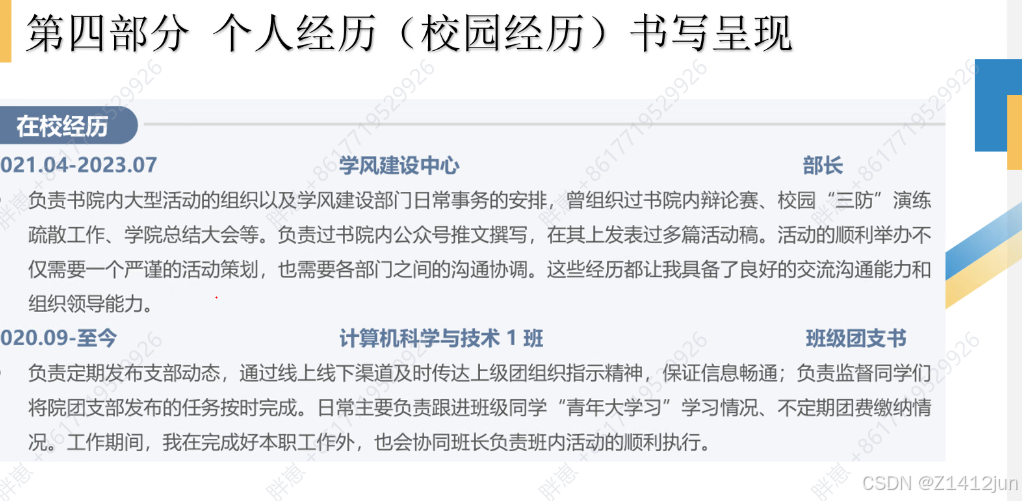 校园经历【党建、会前协助、活动举办、场地租借、动员大会、U20省运会的志愿者服务、党员活动、举办活动调查问卷啊啥的(东西+结果)——干净利落突出自己的能力】