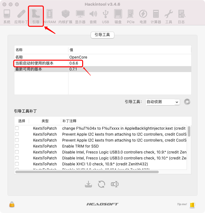 下载好Hackintool 打开软件,点击顶部菜单栏里的【引导】,软件就会自动读取到当前使用的OpenCore版本了,如果有更新,你也可以根据需求进行操作!