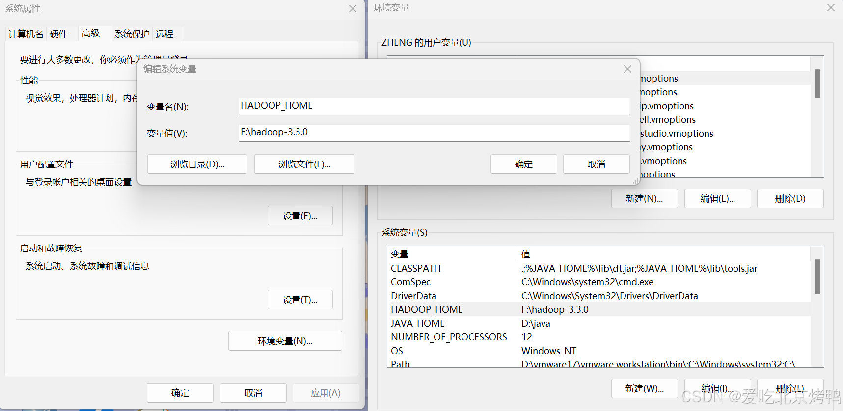 step2:在系统环境变量进行环境变量配置,输入变量名HADOOP_HOME和变量值(根据自己的hadoop安装路径填写,注意:如果安装在了C盘,系统很可能将安装包下载到了C盘中的Program Files目录下,这就导致文件路径含有空格,解决方案为1:将C:\Program Files\hadoop改成C:\PROGRAM~1\hadoop 2:使用双引号将包含空格或特殊字符的路径包起来,如"C:\Program Files"\hadoop