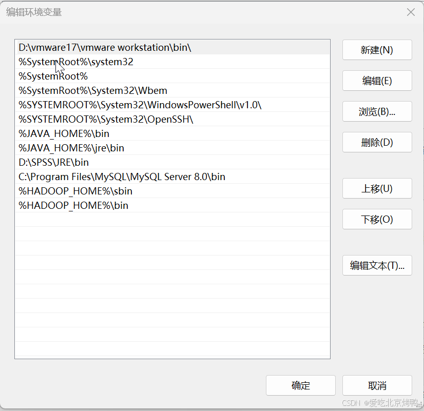 step4:在该窗口中点击[新建],然后输出上图中最后两行内容,指出hadoop中的bin目录和sbin目录,其中%表示引用这个变量名下的变量值,分号表示多个变量环境之间的间隔,这里相当于引用了HADOOP_HOME中的值F:\hadoop-3.3.0,再跟后面的bin和sbin拼接在一起,结合起来就是路径F:\hadoop-3.3.0\sbin目录和F:\hadoop-3.3.0\bin目录