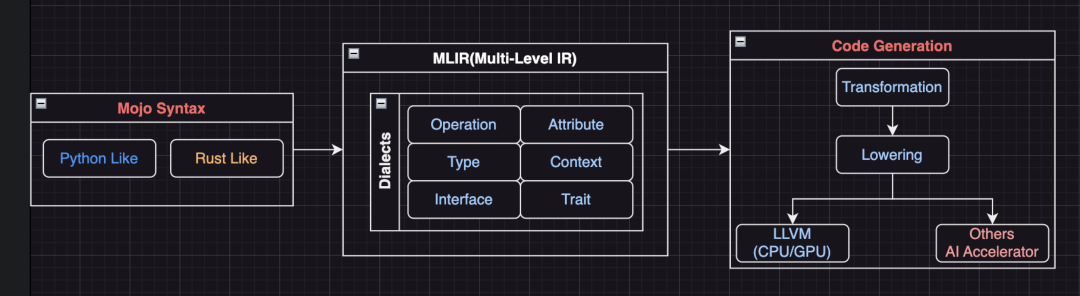 MLIR 是模块化和可扩展的。MLIR 由越来越多的“方言(Dialects)”组成。每个方言定义了算子(Operation)和优化:例如,“math”方言提供了诸如正弦和余弦等数学操作,“amdgpu”方言提供了针对 AMD 处理器的特定操作,等等。方言经过降级之后,Mojo 代码将被编译到指定平台的机器指令。