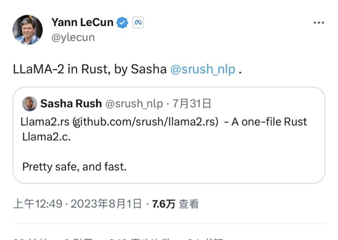 LLama2 Rust今年 7 月份,杨立昆在 X 上转发了来自 Sasha Rush 的开源大模型 LLama2 的纯 Rust 实现 。