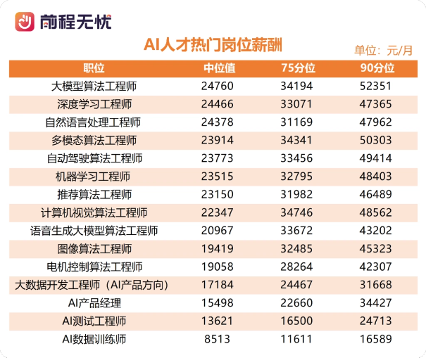 同学们普遍最关心的薪资方面,AI 技术研发类岗位薪酬最高,其中以大模型算法、深度学习、自然语言、多模态算法、机器学习、推荐算法、计算机视觉等硬性 AI 技术研发类岗位的薪酬最高,中位值均达到了 2W 月薪以上。