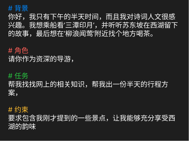 现在,我们来根据这四个要素,拆解一下我们一开始提到的 “西湖导游” 提示词,如下图所示: