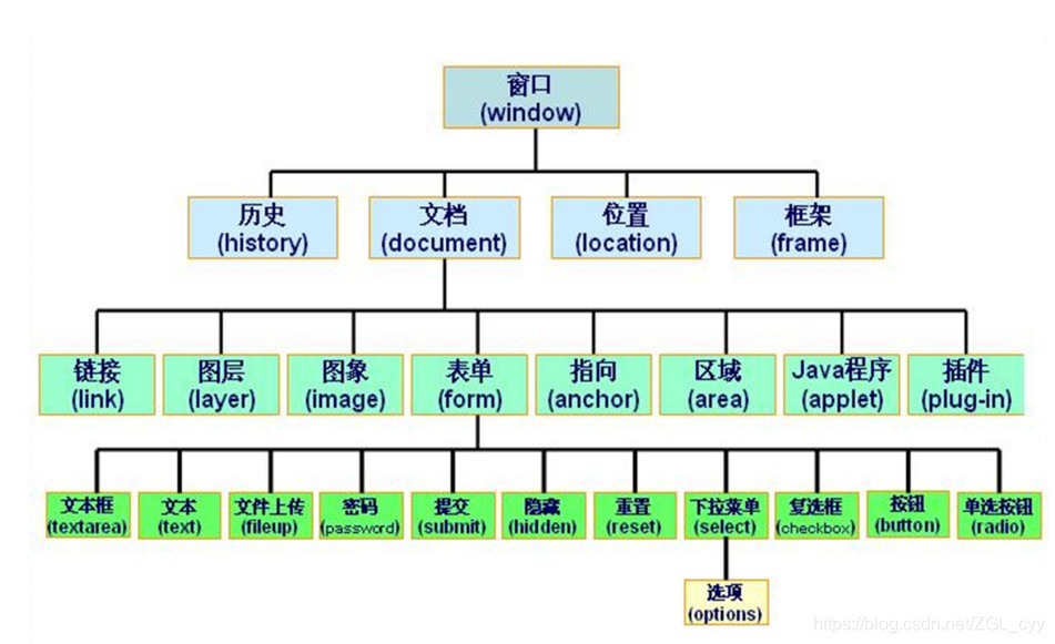 DOM的顶层是document对象蓝色框内是归DOM管的,红色框内归BOM管的;也可以说DOM也是归BOM管的