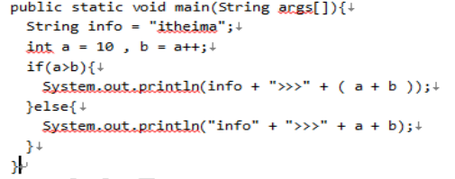 [解析]D 这个题很容易迷惑,因为有个a++容易忽视,所以a=11>b=10走true,info为"itheima",+">>>"其实不是右移运算符就是个字符串,然后加起来后面的21即可.