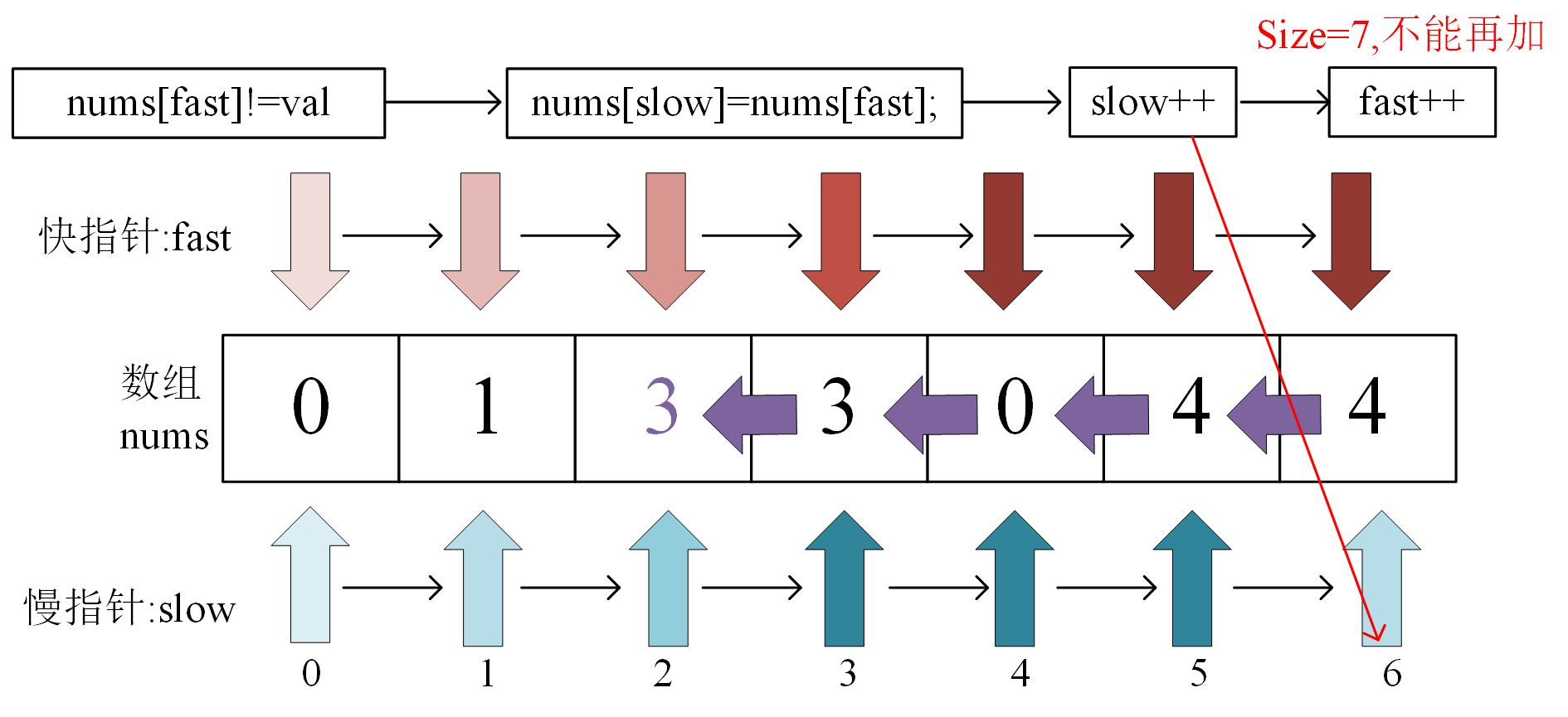类似地,我们看到现在快指针比慢指针要领先一个身为,且对于后续元素3,0,4,都会满足if(nums[fast]!=val)的条件,那么后续的操作就是元素的逐个覆盖了。到最后一步,slow的自增操作优先于fast的移动,因此会把空缺的一步size补上,此时,返回慢指针的索引也就是返回了移除元素后的数组尺寸。(初始size=7,移除后size=6)