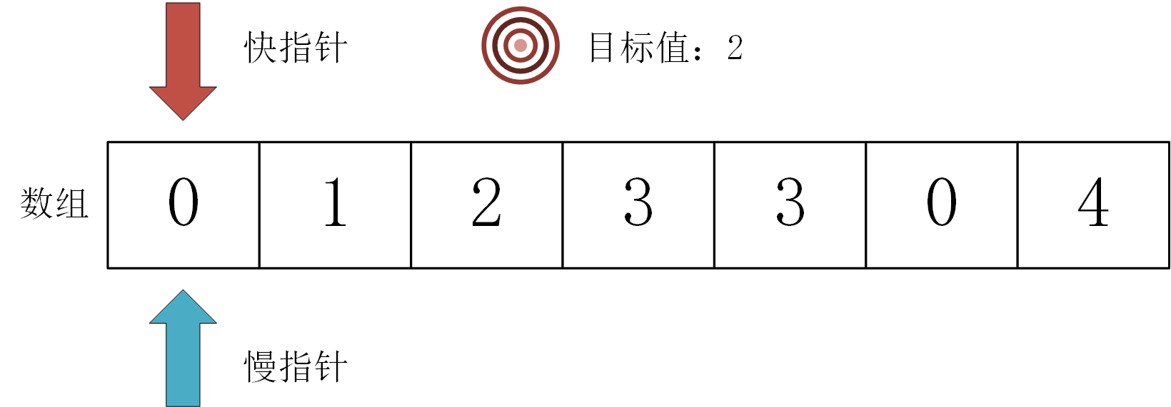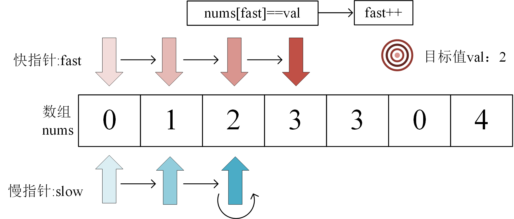 很好,现在遇到了新的情况,那就是快指针的元素和目标值一样了,我们需要把这个元素用后续的元素覆盖掉,为了让这个逻辑“一步到位”,让快指针发挥它的作用,先走一步,慢指针原地不动。