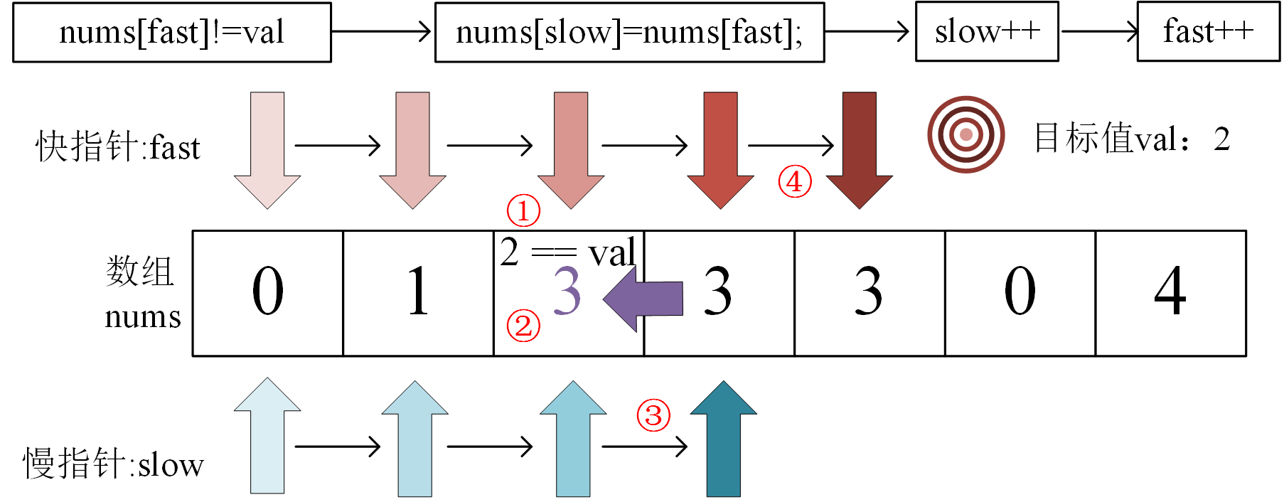 起初在写的时候,惯性思维地写了if(nums[fast]==val),认为等于是判断条件,因此在理解上陷入泥潭。就按原书中给的示例数组[0,1,2,3,3,0,4],val=2为例。