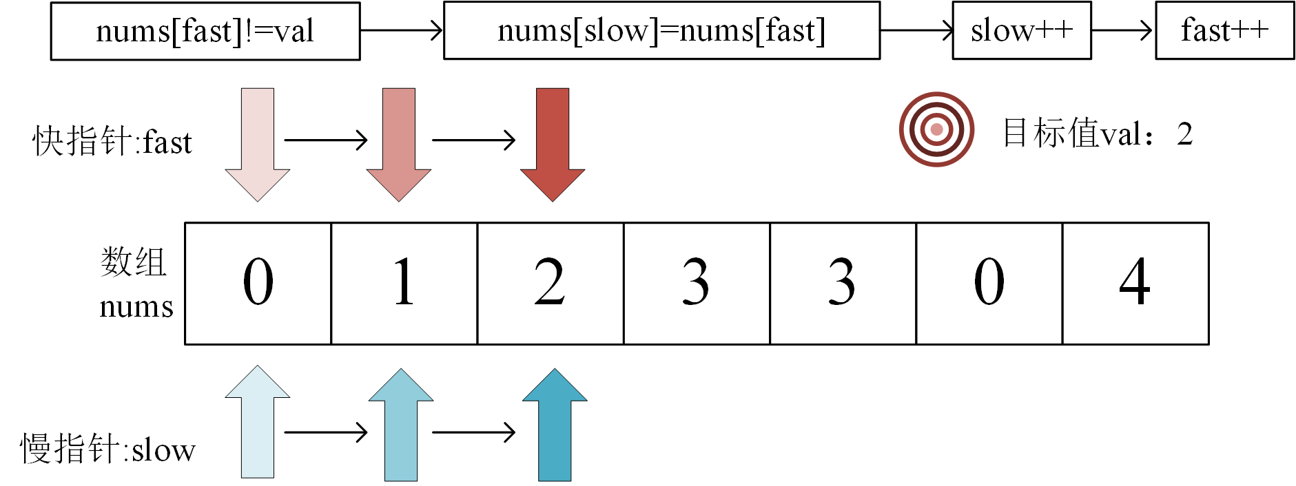 代码起初定义慢指针和快指针都在第一个元素上,对于前两个元素,代码执行的逻辑是一样的,先判断快指针元素和目标值是否相同,如果不相同,那么把快指针指向的元素赋值给慢指针,随后慢指针移动,快指针移动。