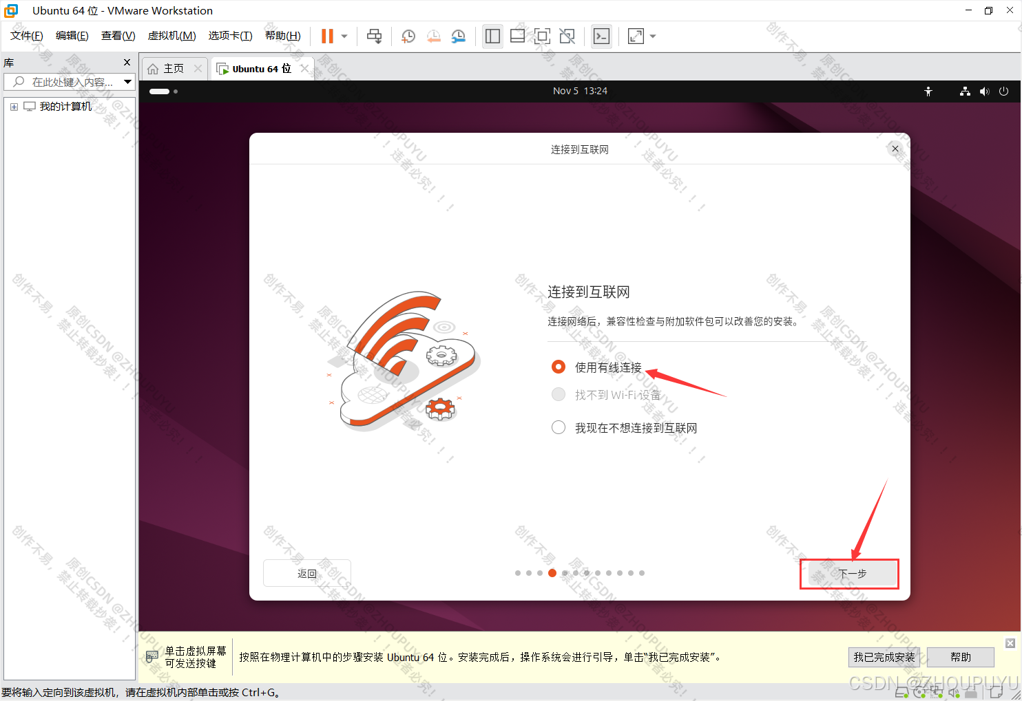 点击关闭按钮(如下图),断开电脑网络,不会断网的直接拔掉网线即可,然后跟着教程重新启动虚拟机,在重复一遍Ubuntu安装流程即可完成安装。