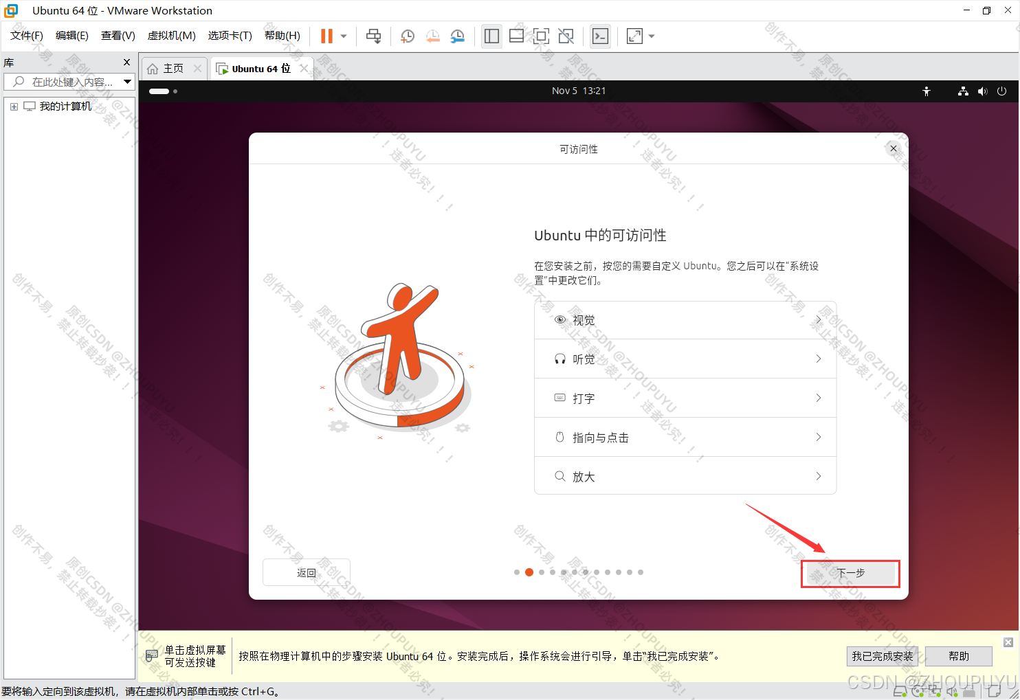 4.选择操作系统【Linux】和版本【Ubuntu 64位】,然后点击下一步