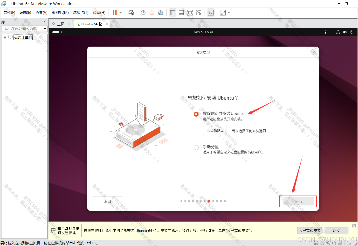 15.选择【擦除磁盘并安装Ununtu】,然后点击下一步