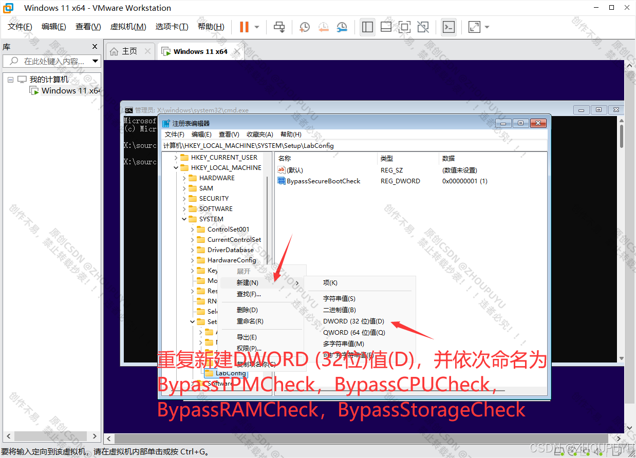 10.重复新建以下DWORD (32位)值(D),并依次命名为BypassTPMCheck,BypassCPUCheck,BypassRAMCheck,BypassStorageCheck并且数值都修改成1。