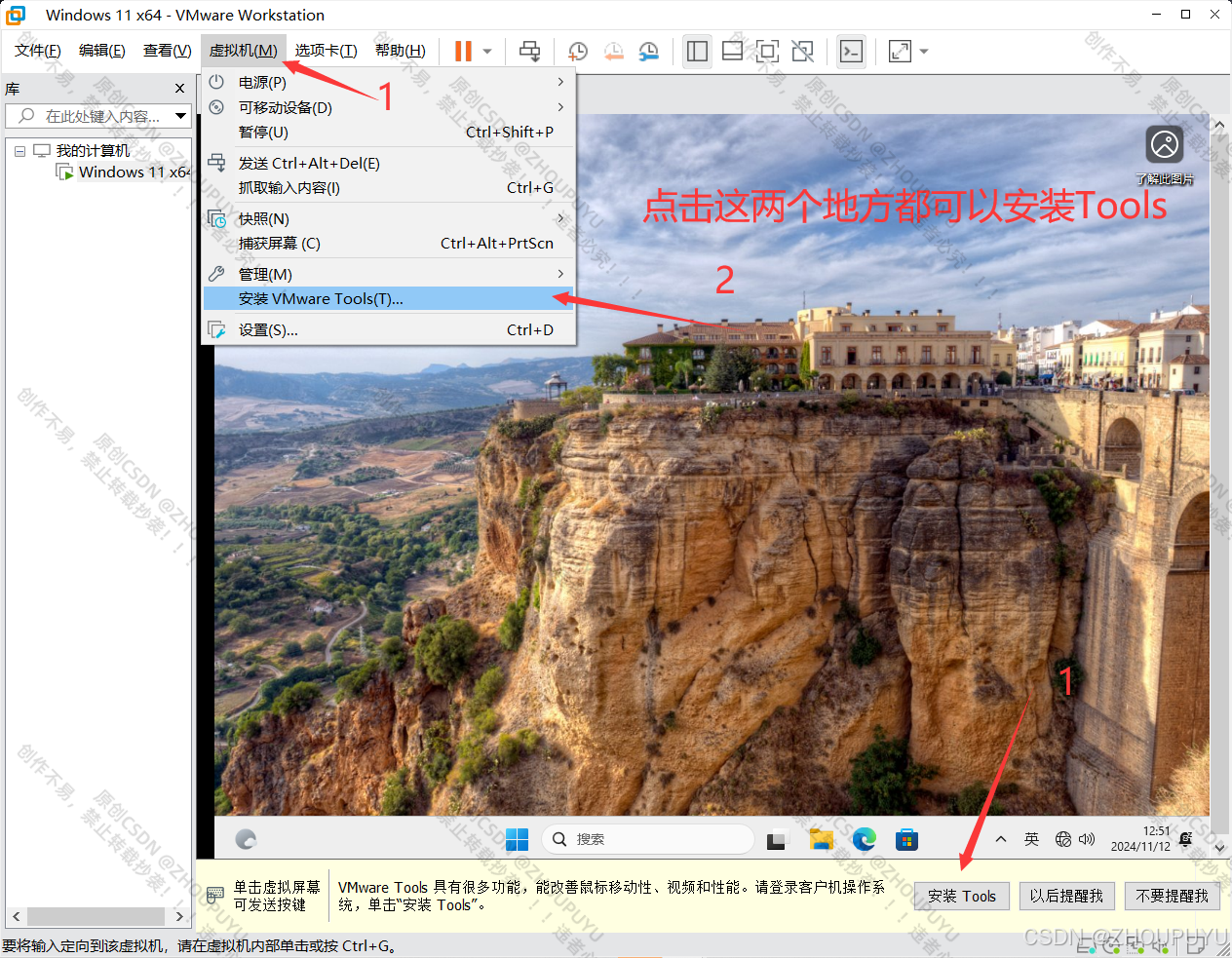 点击虚拟机然后再点击安装Tools,或者直接点击底部弹窗安装Tools,两个方法都一样。