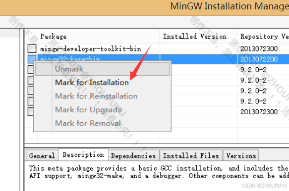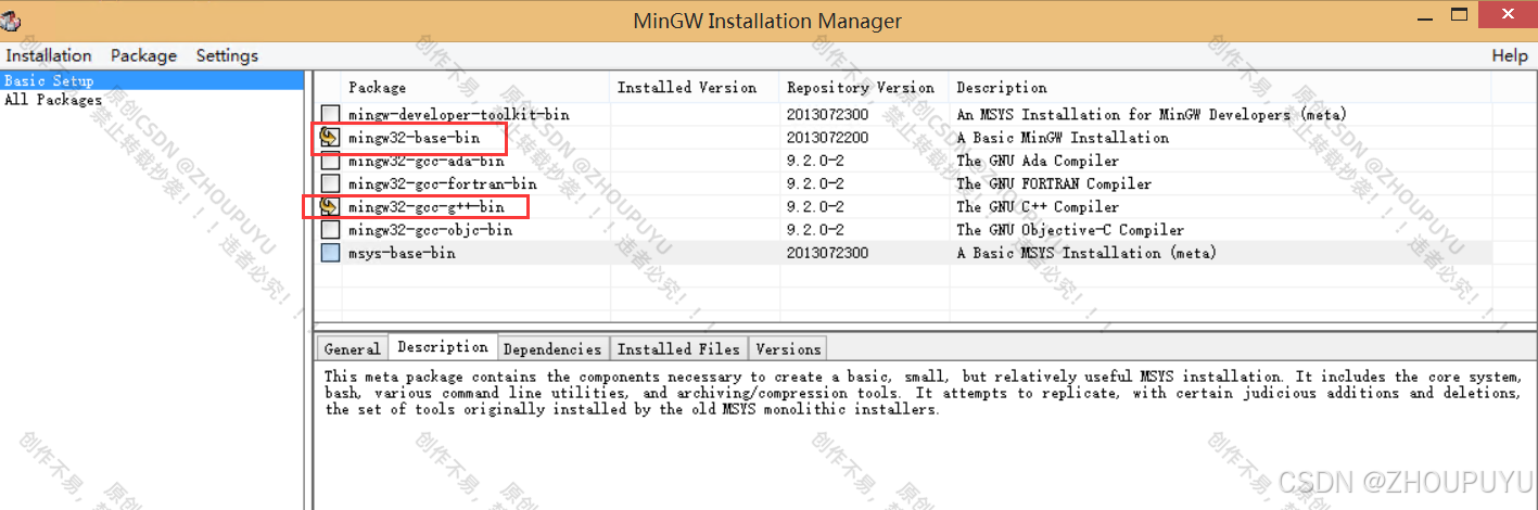 勾选【mingw32-base-bin】和【mingw32-gcc-g++-bin】即支持C和C++,如果还需要别的开发环境,可以自己勾选。