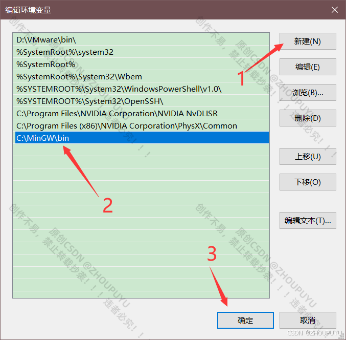 4.新建一个环境变量名为【C:\MinGW\bin】,再点击【确定】 ;