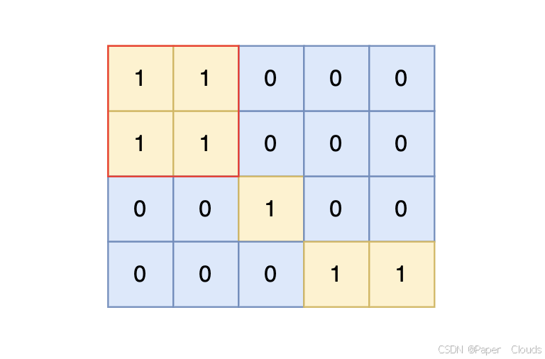 第一行包含两个整数 N, M,表示矩阵的行数和列数。后续 N 行,每行包含 M 个数字,数字为 1 或者 0,表示岛屿的单元格。