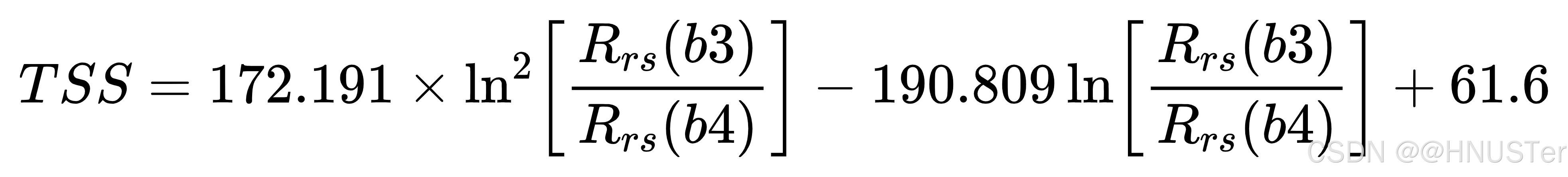 总悬浮固体(TSS)是水体环境的重要指标,代码通过 “基于绿波段与红波段反射率比值的对数模型” 反演 TSS 浓度,核心公式为:TSS = 172.191×[log(Green/Red)]² - 190.809×log(Green/Red) + 61.6(该公式为基于实测数据拟合的经验模型,适用于特定区域的水体类型)