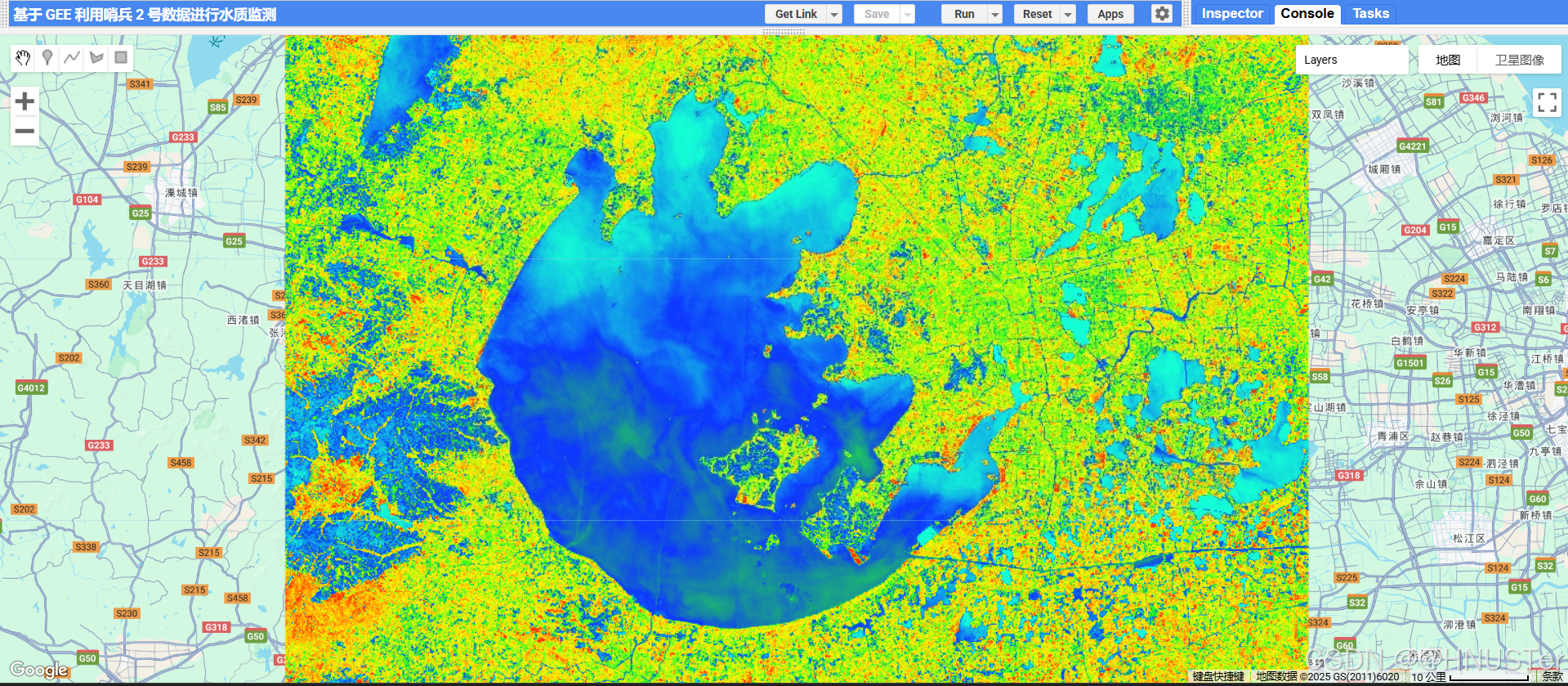 本代码的核心优势在于 “数据筛选严格”(多条件去云、时空限制)和 “结果直观”(真彩色 + TSS 专题图对比),但需注意:经验模型具有区域局限性,若应用于其他区域,需重新拟合 TSS 反演公式中的系数。