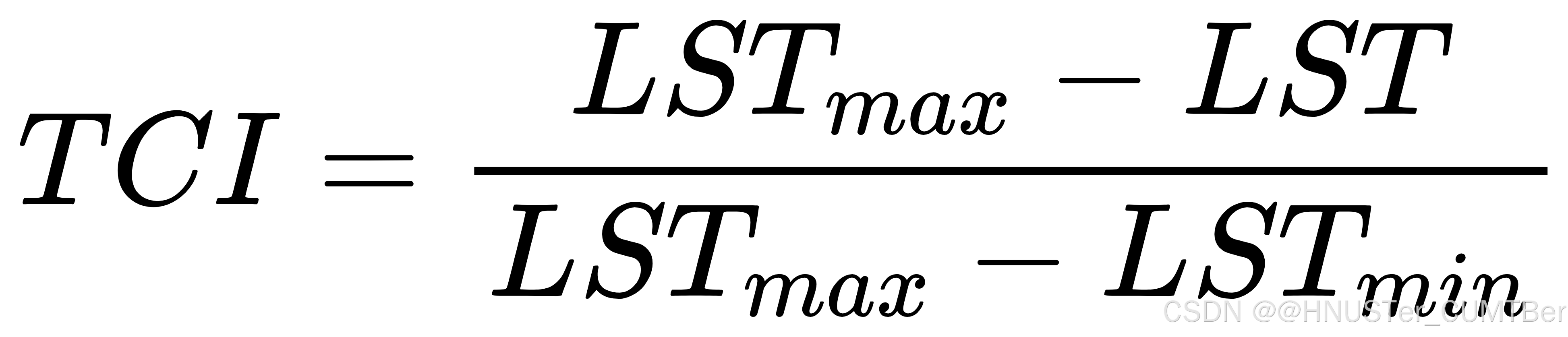 - 核心差异:与 VCI 公式相反,TCI 以(max - lst)为分子 —— 因高温对植被不利,当前温度(lst)越低,分子越大,TCI 值越高,代表温度胁迫越轻。