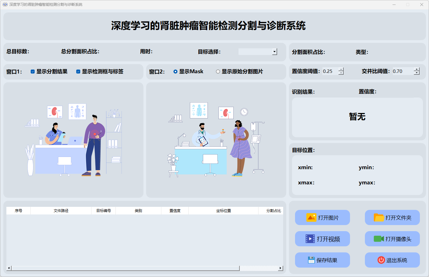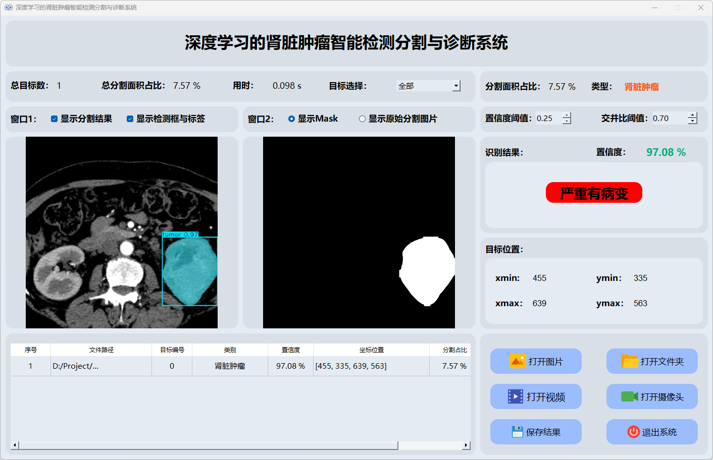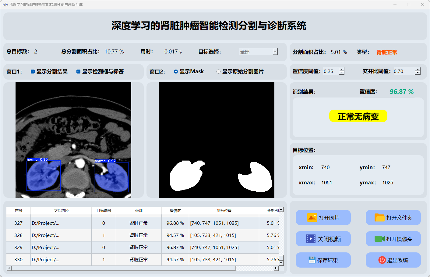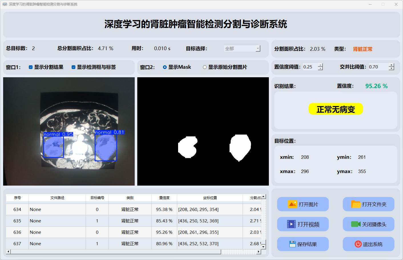 检测结果:系统连接摄像头进行实时分析,检测到肾脏肿瘤分割图像并显示检测结果。实时显示摄像头画面,并将检测到的行为位置标注在图像上,表格下方记录了每一帧中检测结果的详细信息。