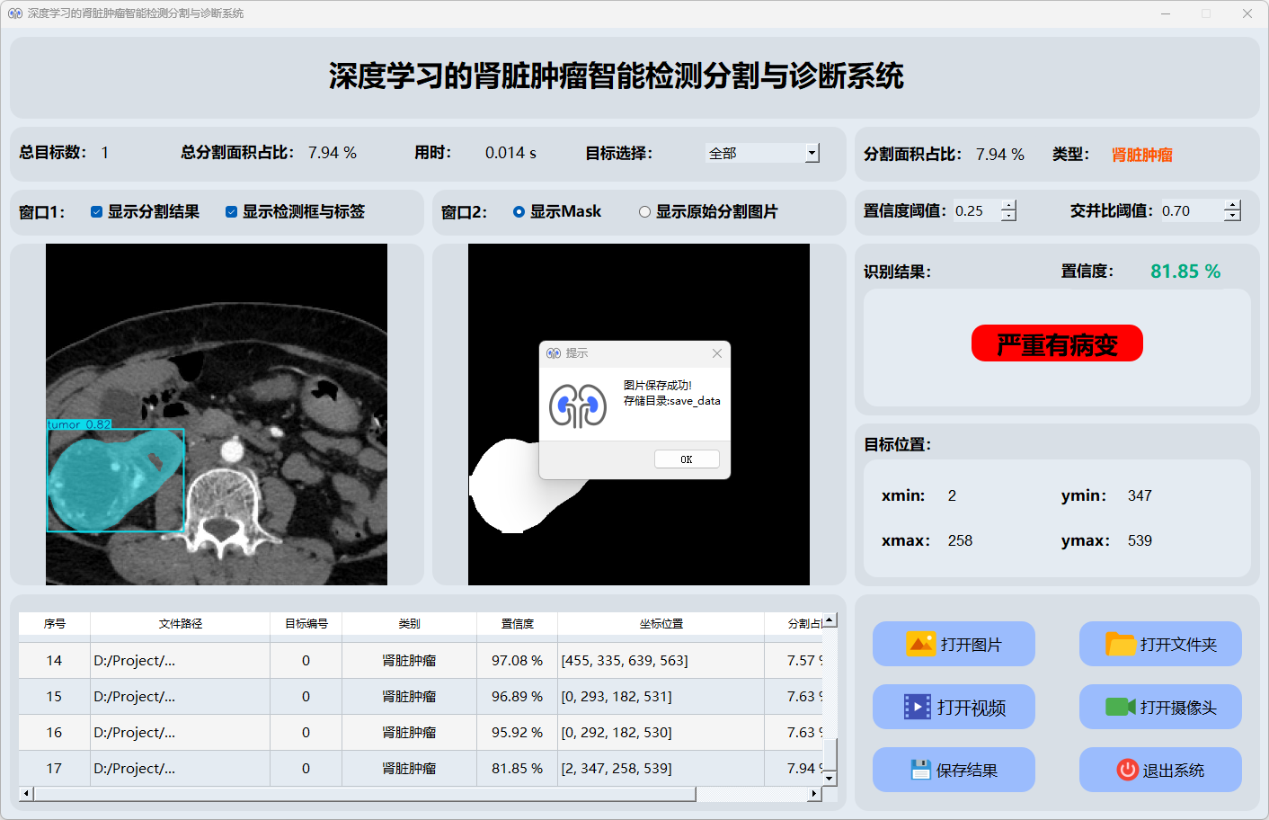 这个界面展示了系统对视频帧中的多目标检测能力,能够准确识别肾脏肿瘤分割图像,并提供详细的检测结果和置信度评分。