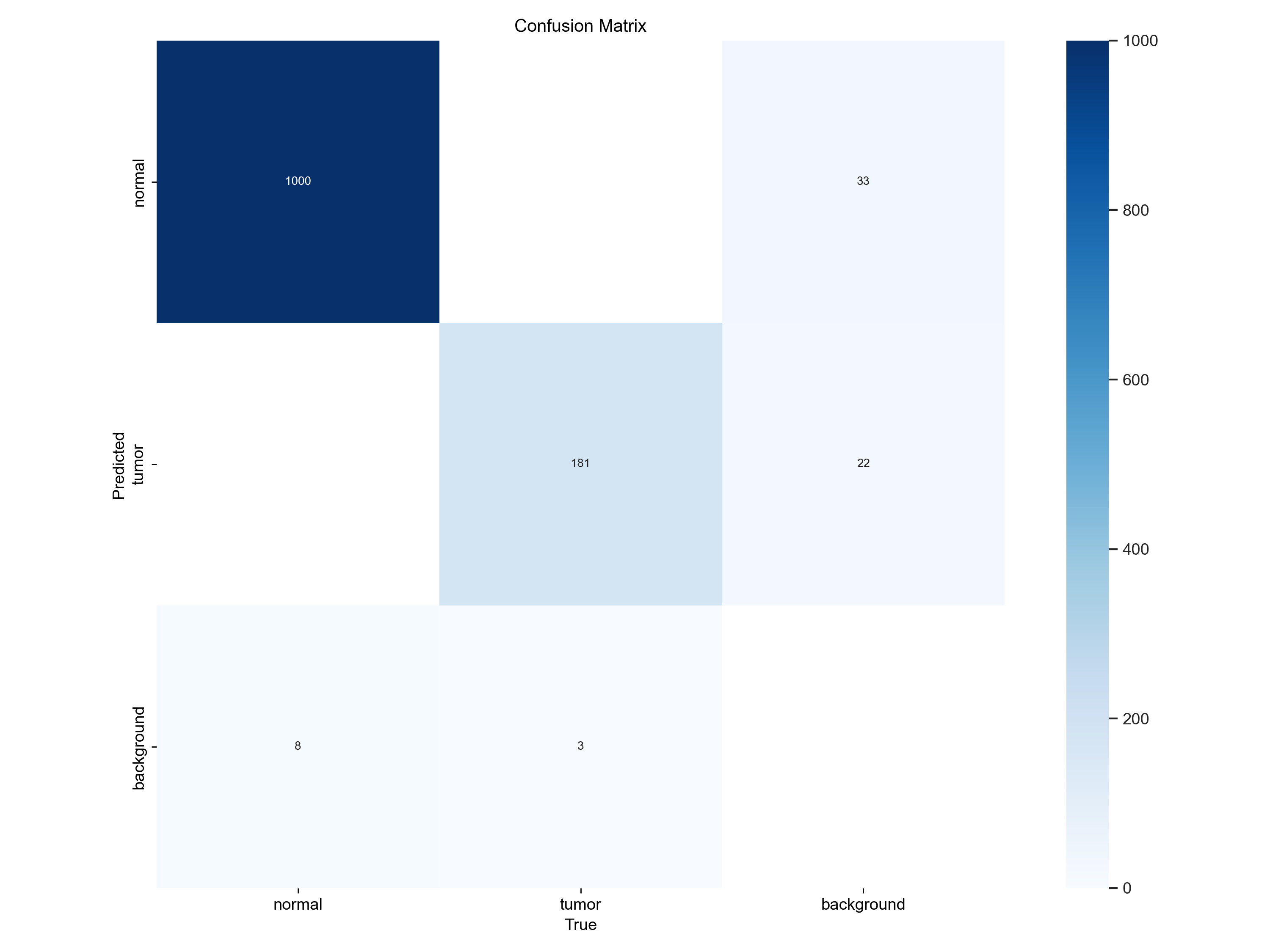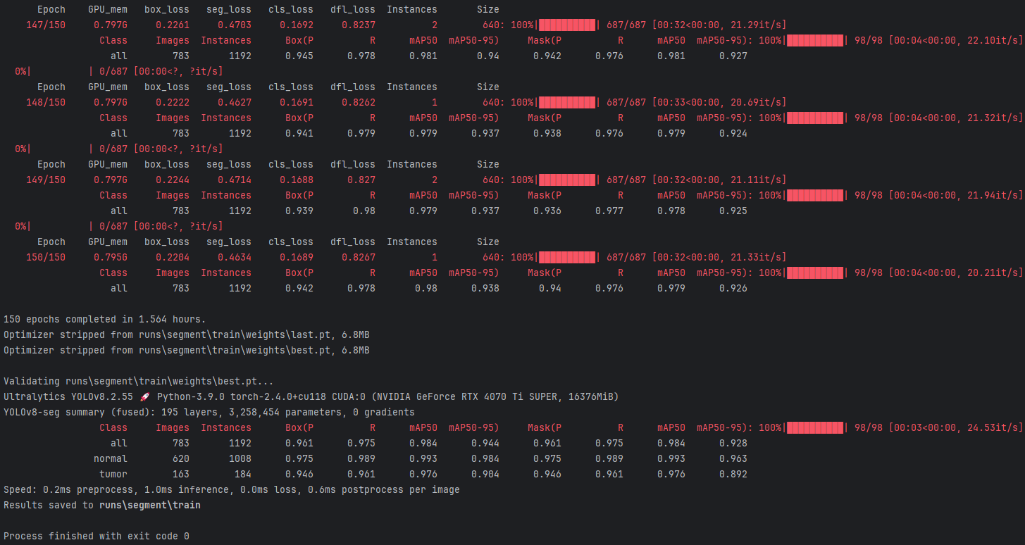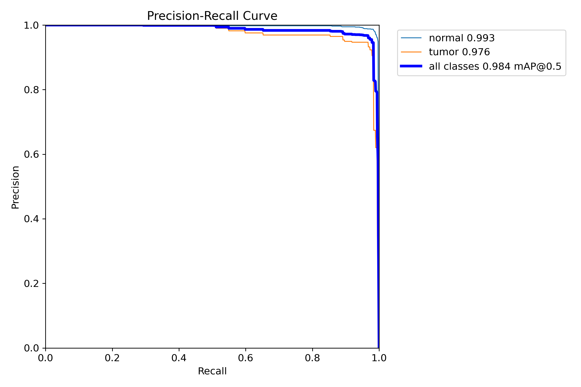 模型训练完成,mAP50-95 达 92.6%,推理速度快,肿瘤检测略逊于正常组织,可进一步优化数据增强和参数调整。