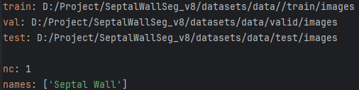 接着需要新建一个data.yaml文件,用于存储训练数据的路径及模型需要进行检测的类别。YOLOv8在进行模型训练时,会读取该文件的信息,用于进行模型的训练与验证。