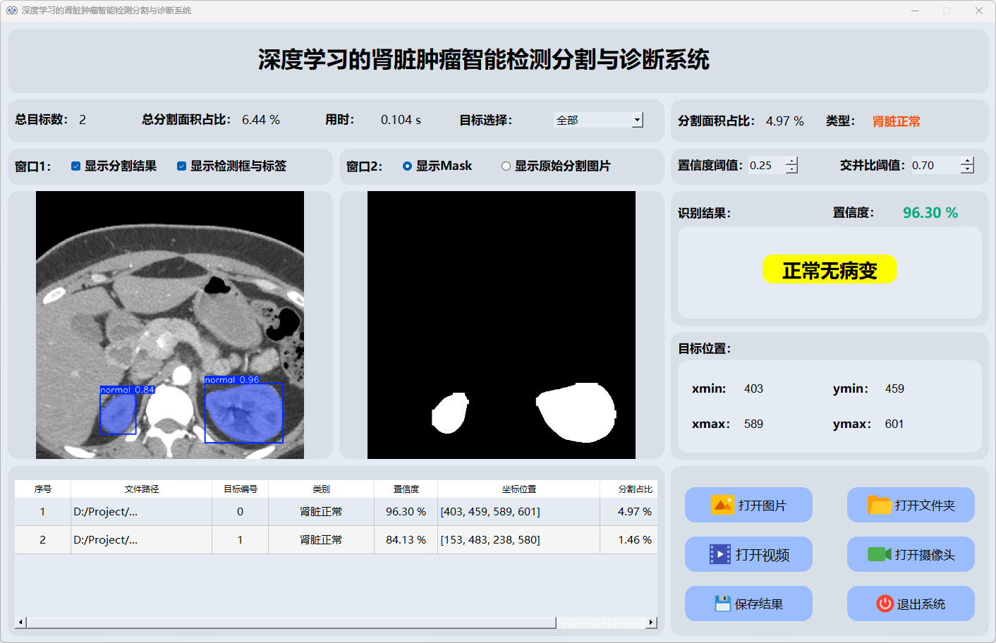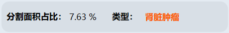 检测结果:系统识别出图片中的肾脏肿瘤分割图像情况,并显示检测结果,包括总目标数、用时、目标类型、置信度、以及目标的位置坐标信息。