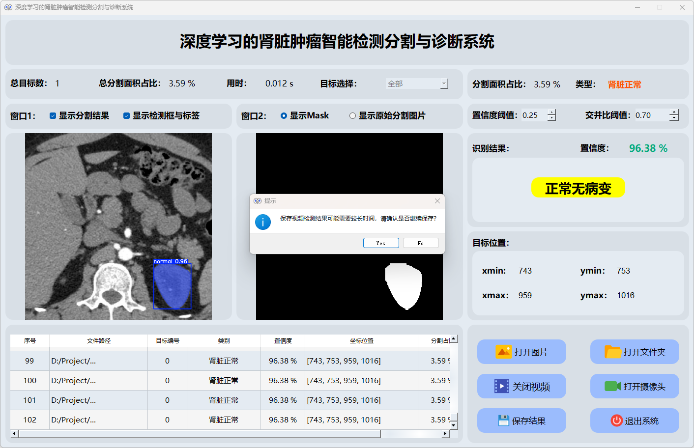 检测结果:系统对视频进行实时分析,检测到肾脏肿瘤分割图像并显示检测结果。表格显示了视频中多个检测结果的置信度和位置信息。