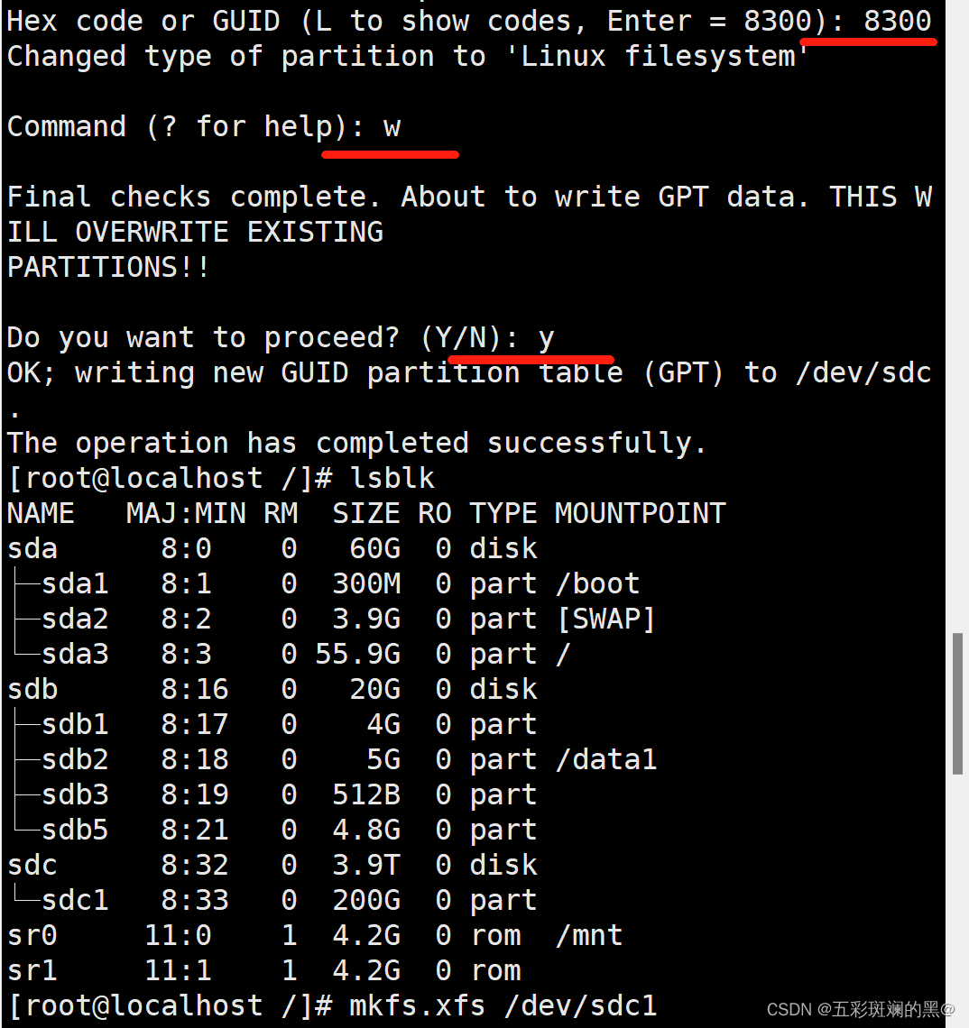 使用gdisk 分一个大于2T的硬盘,然后使用永久挂载的方式实现,分区的大小为200G 文件系统类型: xfs
