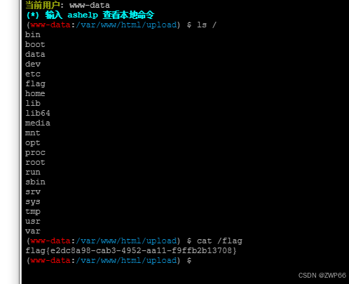 连接成功过后,进入虚拟终端。在终端中输入ls / 查看文件,发现有flag使用cat 、flag查看文件中的内容得到flag。
