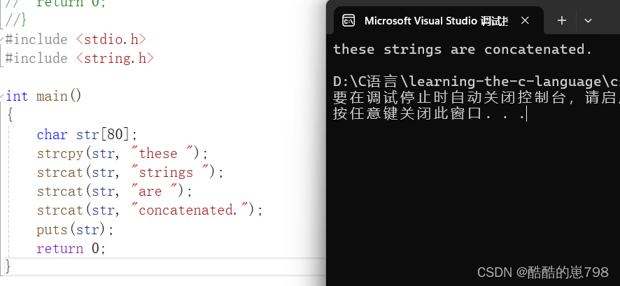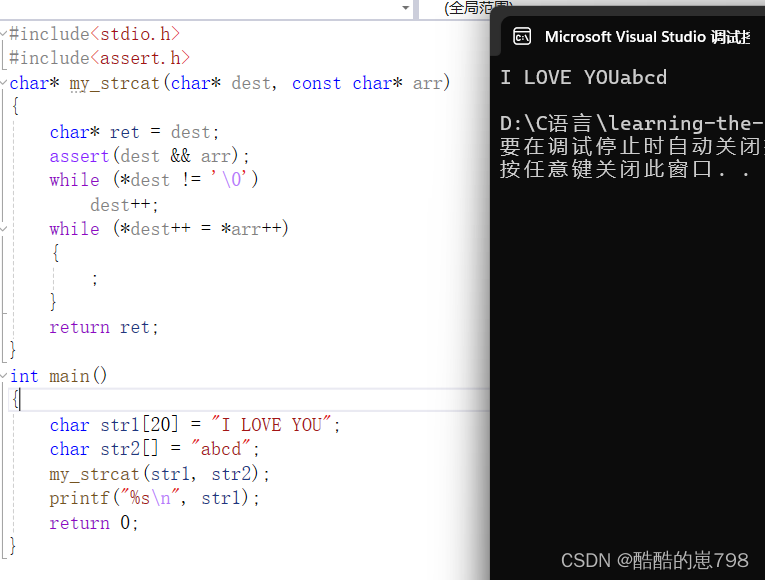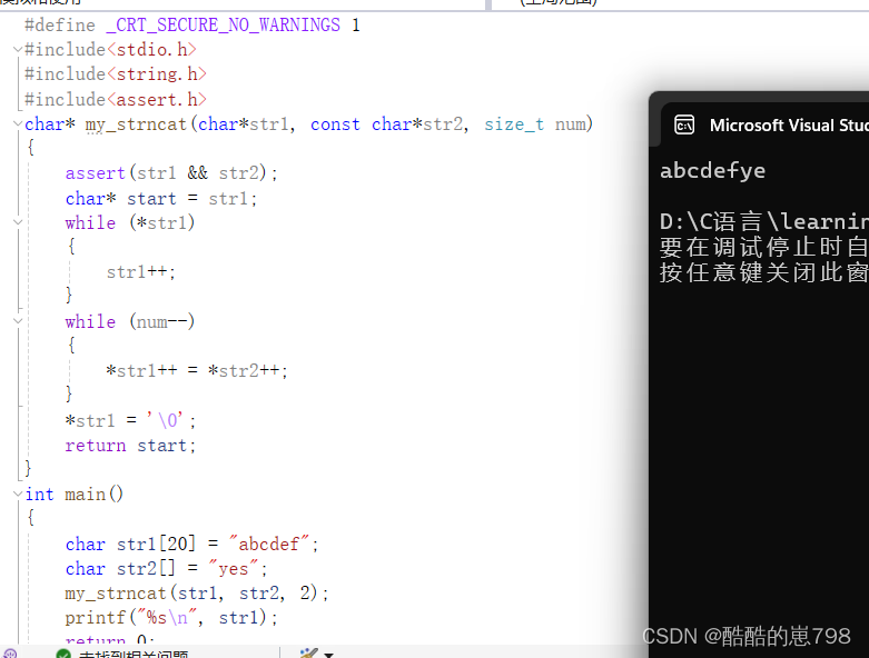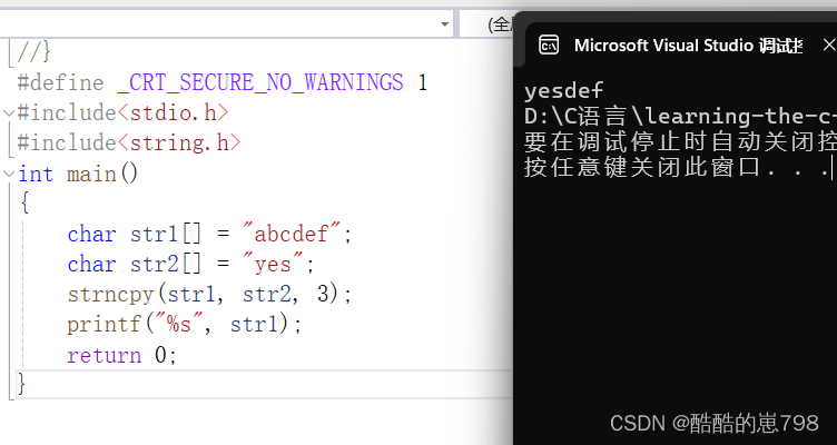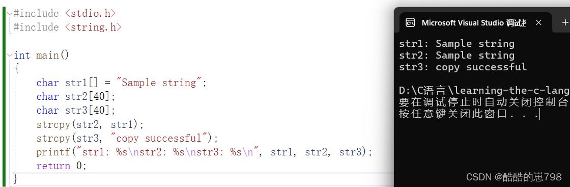//所以源字符串必须以’\0’结束,也会将源字符串的’\0’拷贝到目标空间