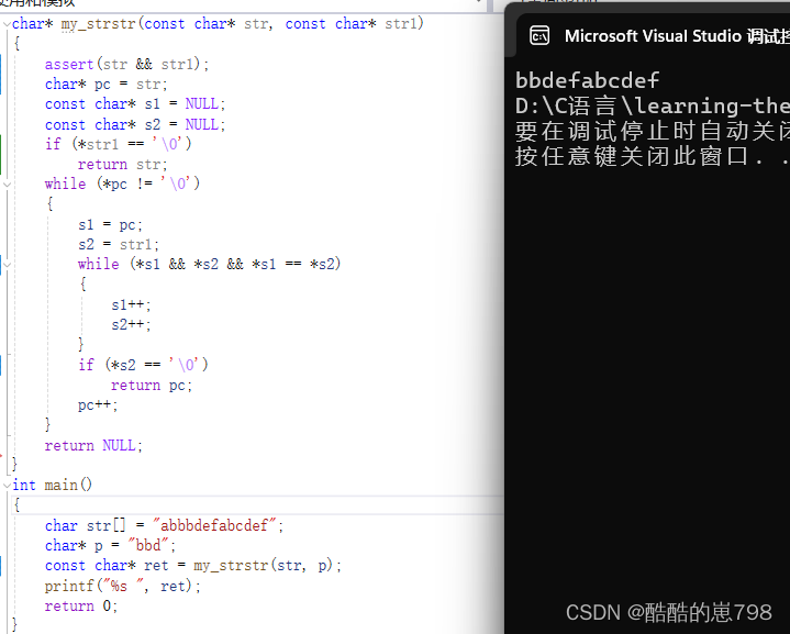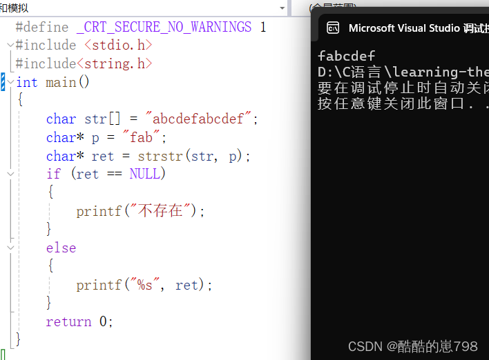 从字符串1中找到字符串2相同的字符串,然后输出字符串1中从字符串2相同位置开始的字符到‘\0’,如果没有就不输出