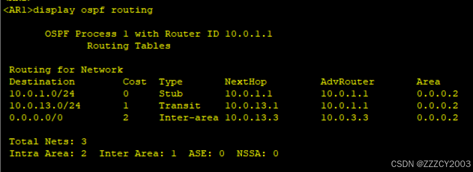 现在AR1上不存在LSA类型4、LSA类型5,去往OSPF域外通过ABR生成的LSA类型3所携带的缺省路由条目实现。同时前往其他区域的LSA类型3也存在