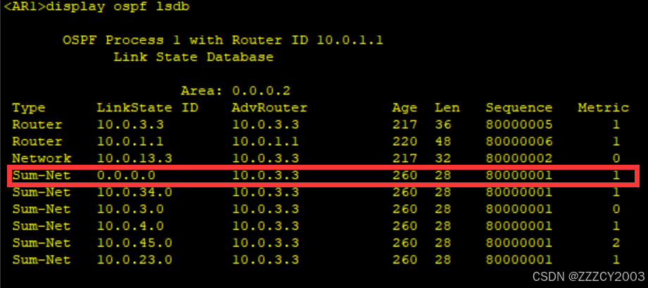 此时原本太多条OSPF区域间路由只剩下一条0.0.0.0/0的缺省路由,LSDB中LSA类型3只剩下一条0.0.0.0