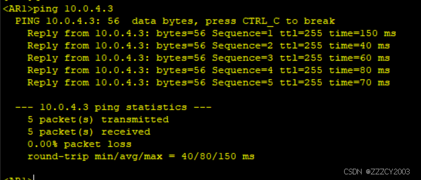 执行ping命令,测试VLAN 2中的LSW4能否与VLAN 4中的AR1通信